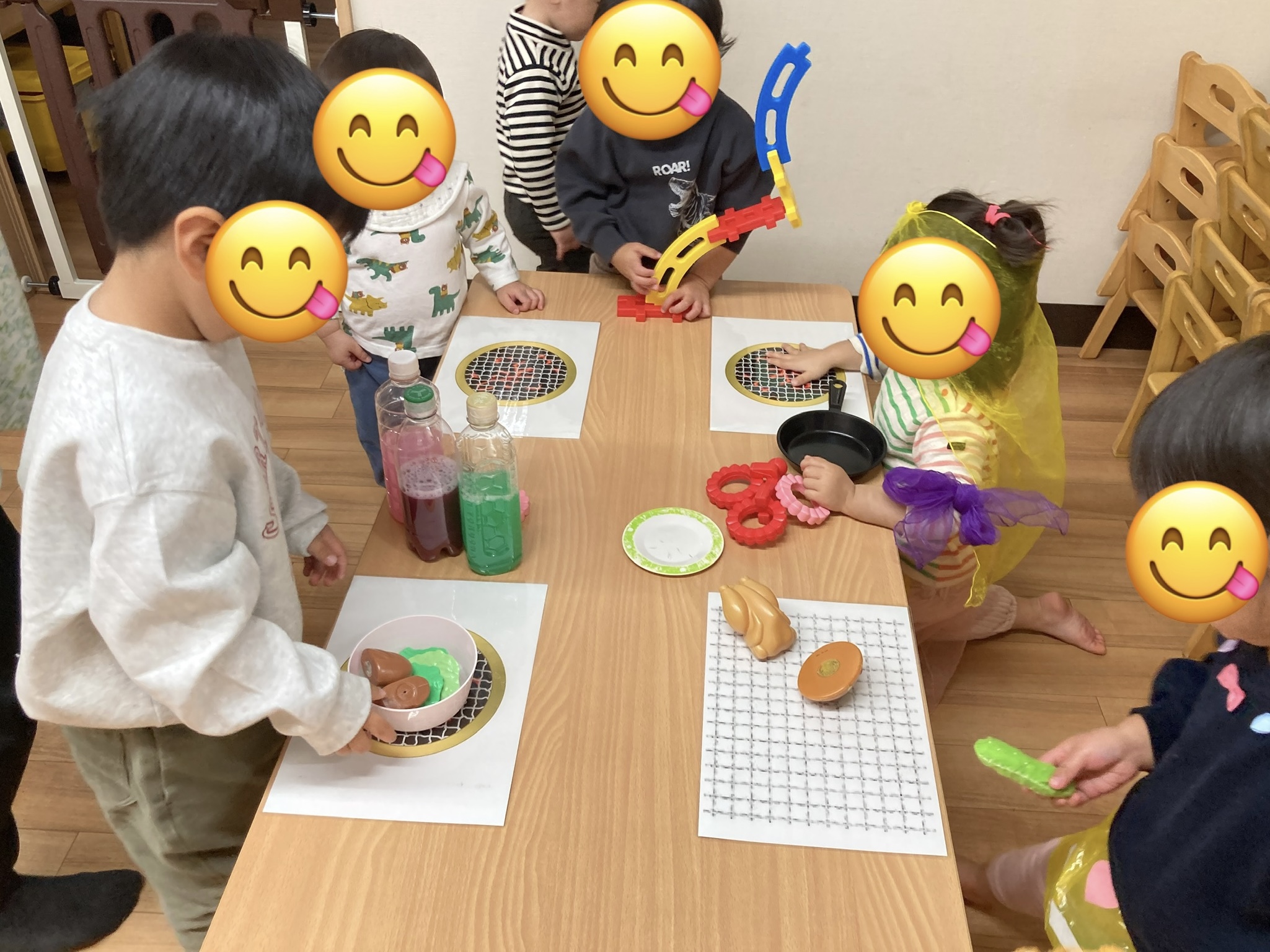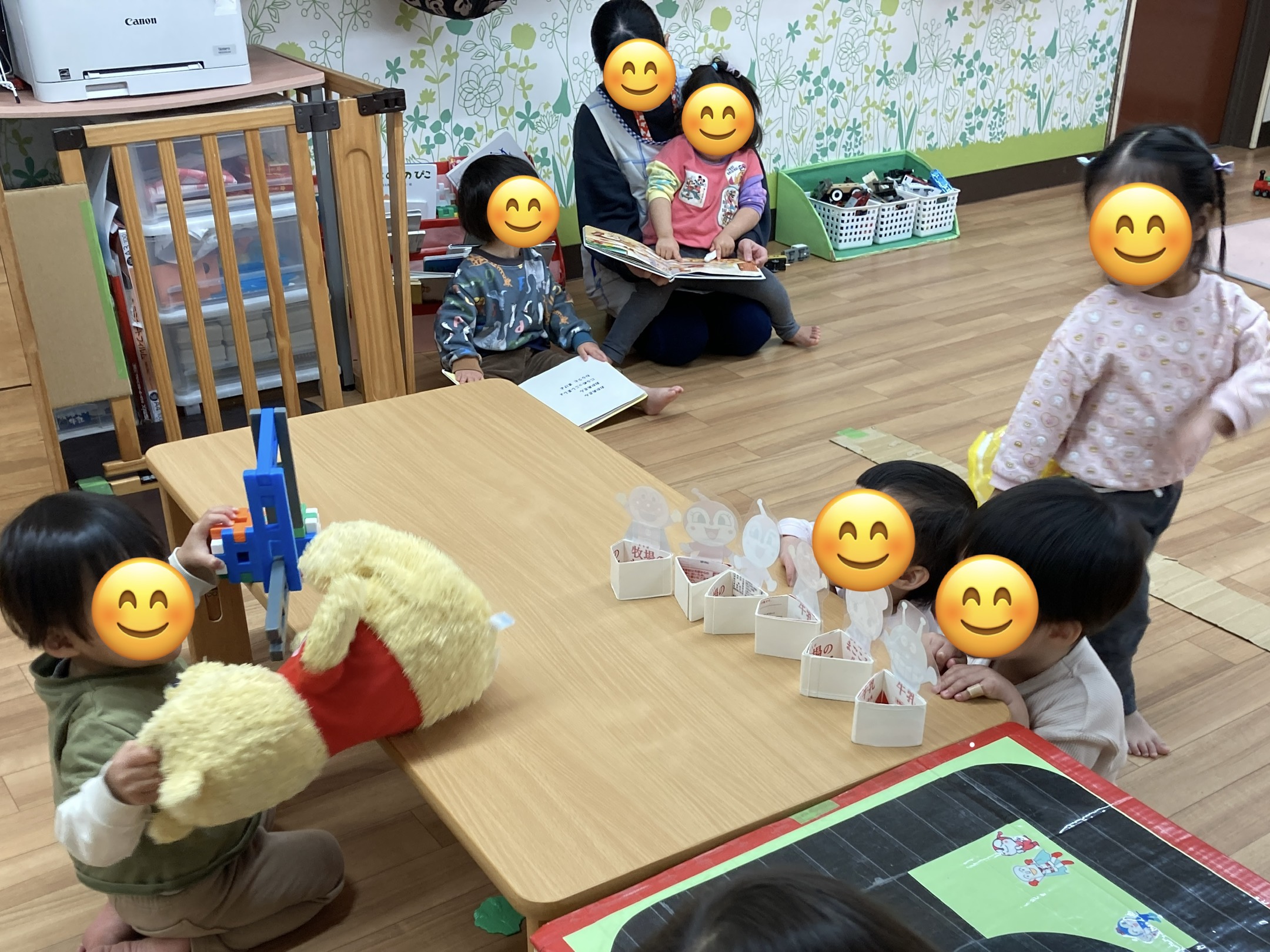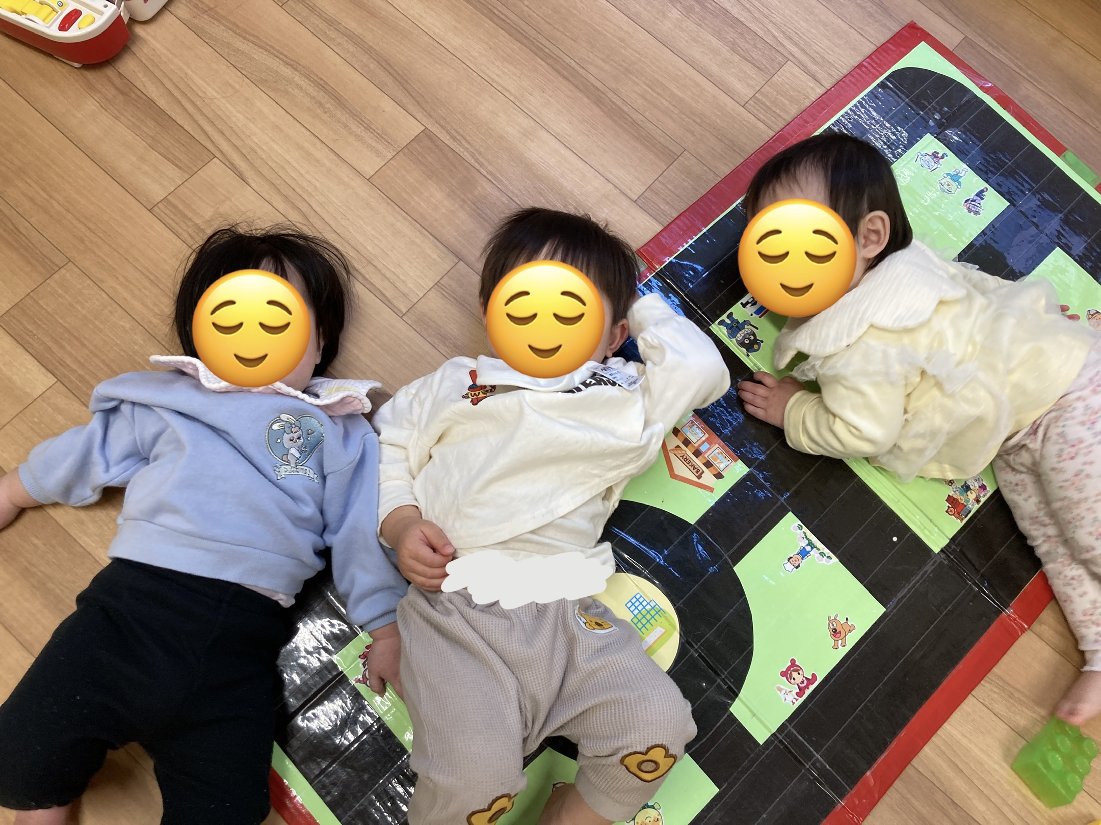 お部屋の中では、お人形でごっこ遊びをしたり、手作りのアンパンマンの玩具を集めて並べたり、レールの上を電車で走ったり、寝転んでゆったりしたり…好きな遊びを見つけて楽しんでいます♪