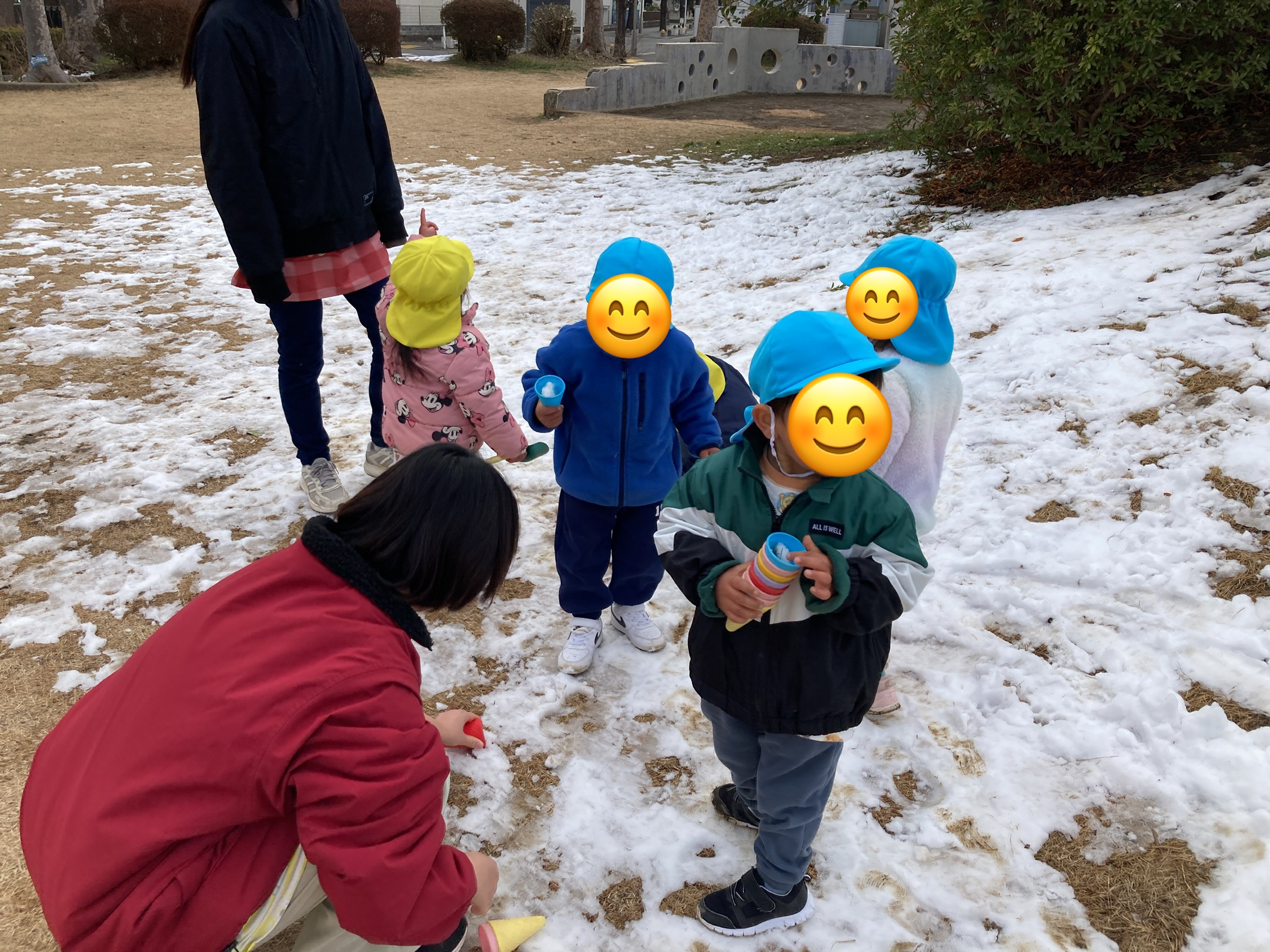 子どもたちは雪に興味津々!公園に残っていた雪を見ると「雪だー!」と言って触りに行っていました!