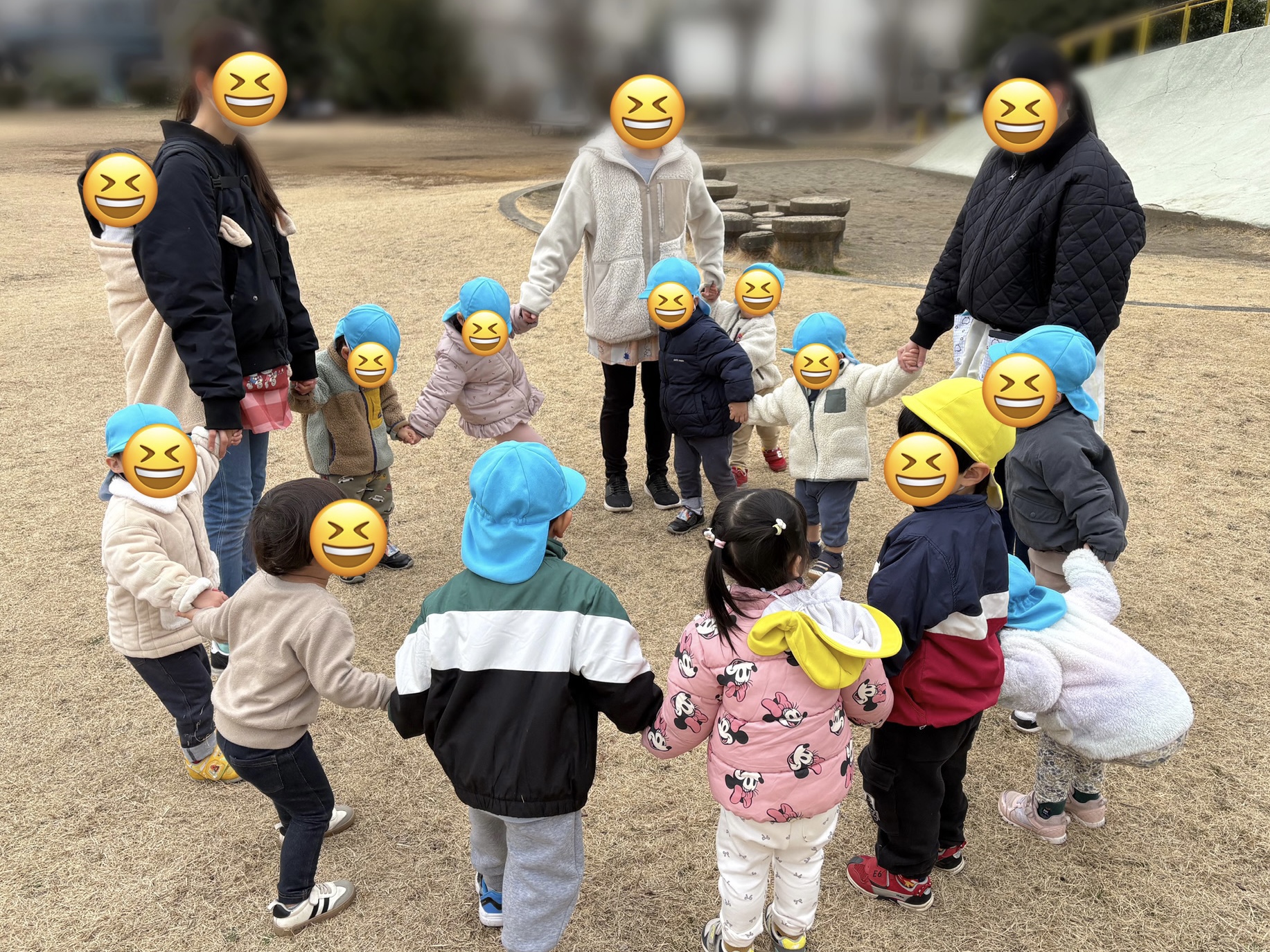 公園に着いたら手を繋いで丸くなり、「手を繋ごう〜みんなで手を繋ごう〜」大きな声で歌ってから遊び始めます♪