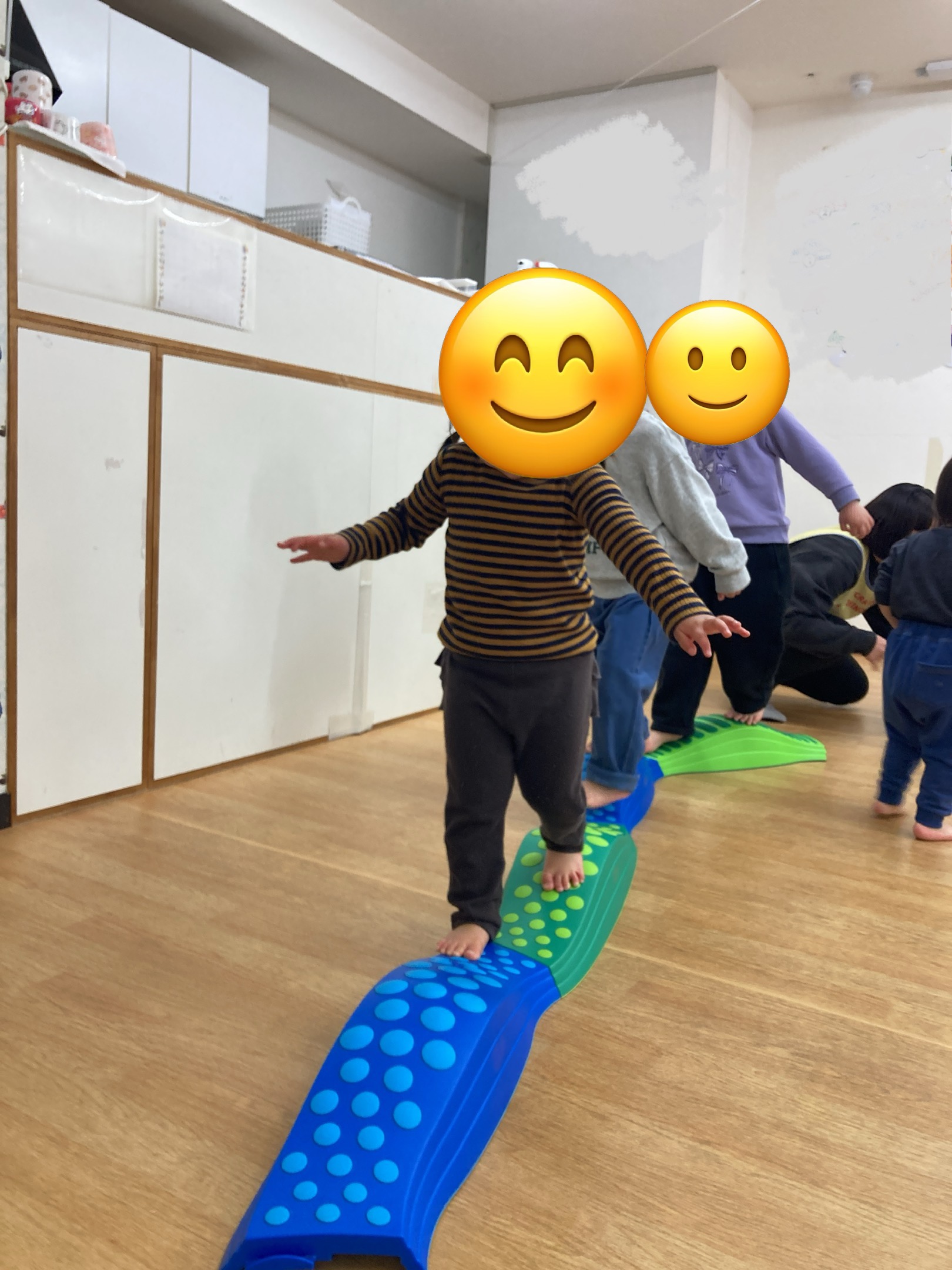 はじめは不安で保育士と手をつないでいた平均台もバランスをとって歩けるようになりました。