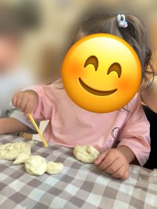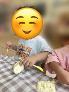エプロン、三角巾、マスクと準備万端な2歳児クラスのお友達😊