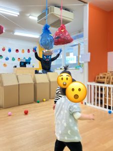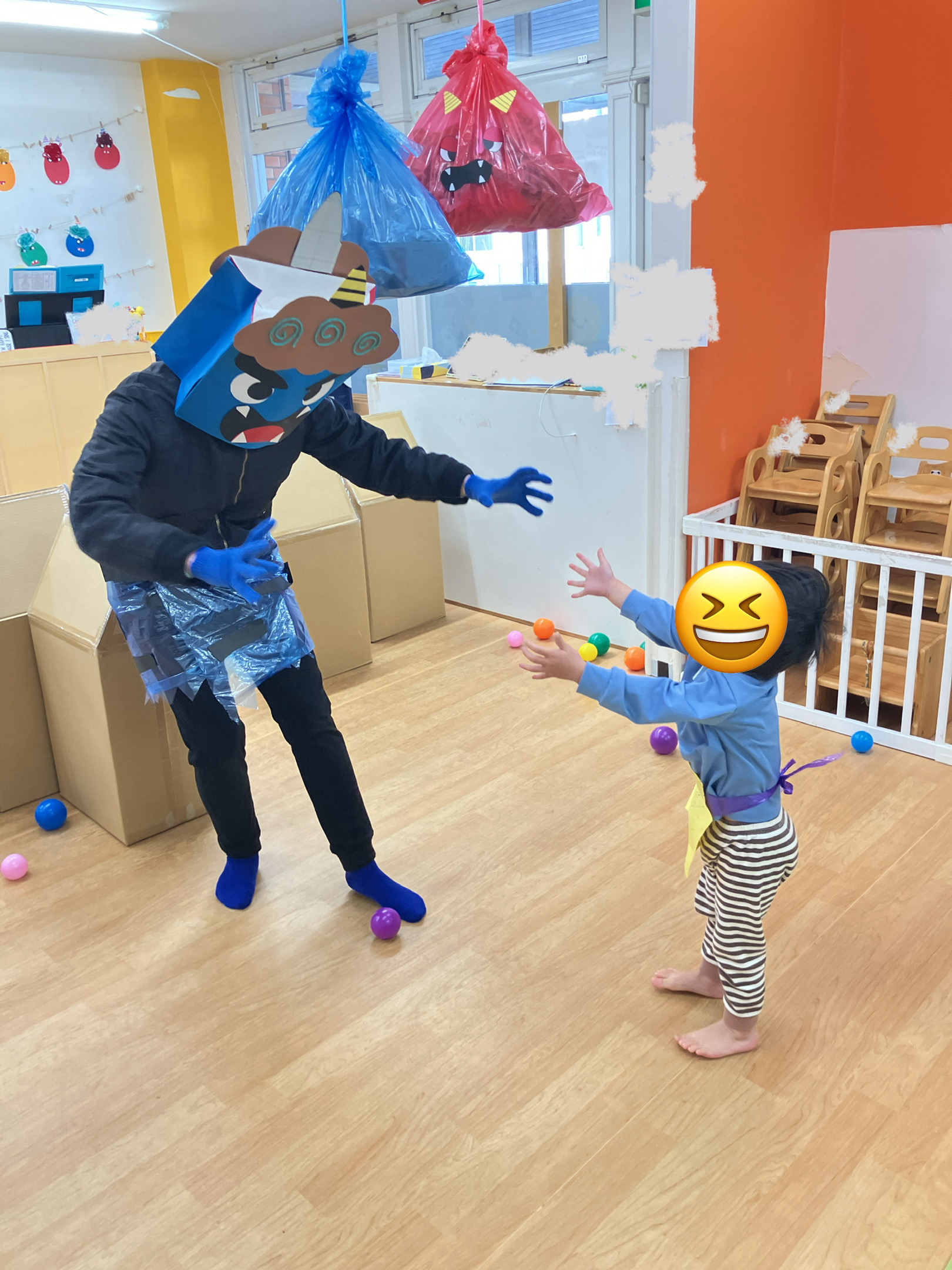 ボールを豆に見立てて「おにはそと〜!ふくはうち〜♪」
