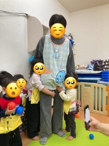 大慌てで保育士の後ろに隠れる子やキョトンと動かない子💦