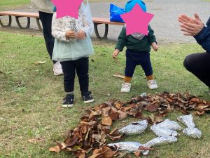 アルミホイルに包んださつまいもに枯れ葉をかけて、美味しくなるように…と♩やきいもグーチーパーを元気に歌いました😊